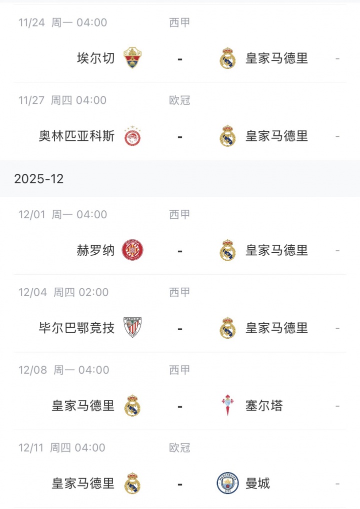 皇马将在国外比赛日死心后迎来纠合四个客场,以及将迎来与曼城的欧冠比赛,记者Picon合计,这是对阿隆索的一次大考,他写谈:“纠合三个客场征程,包括对阵本赛季黑马埃尔切与毕尔巴鄂竞技。而远处巨兽隐现:与曼城的对决,将成为覆按这支球队是否具备抗衡欧洲顶级豪强实力的又一次大考——本赛季他们已两度失利。”