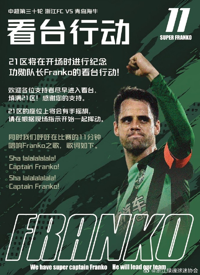 11月21日讯 中超收官战,浙江队将对阵青岛海牛。赛前,浙江绿魂球迷协会发布“11.22看台活动公告”问候功勋队长弗兰克。
