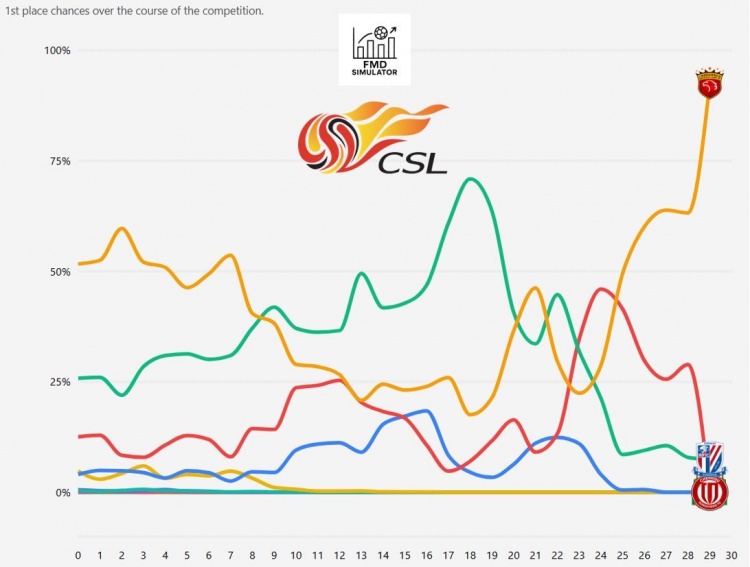 收官战运行前,数据平台“footballmeetsdata”在推特上列出了中超争冠球队的夺冠概率走势,其中: