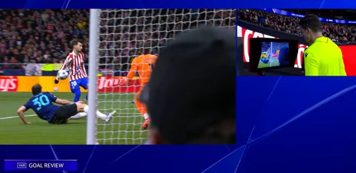 在此次弹珠台般的聚合反弹中,阿尔瓦雷斯得球后跳跃门将索默将球打进。主裁判勒西洋耶当即判罚进球无效,明确指出他以为马竞球员存在违纪触球从而影响了紧要发展。但比赛并未立即还原,VAR裁核查合手续了数分钟,随后主裁判到场边搜检回放。