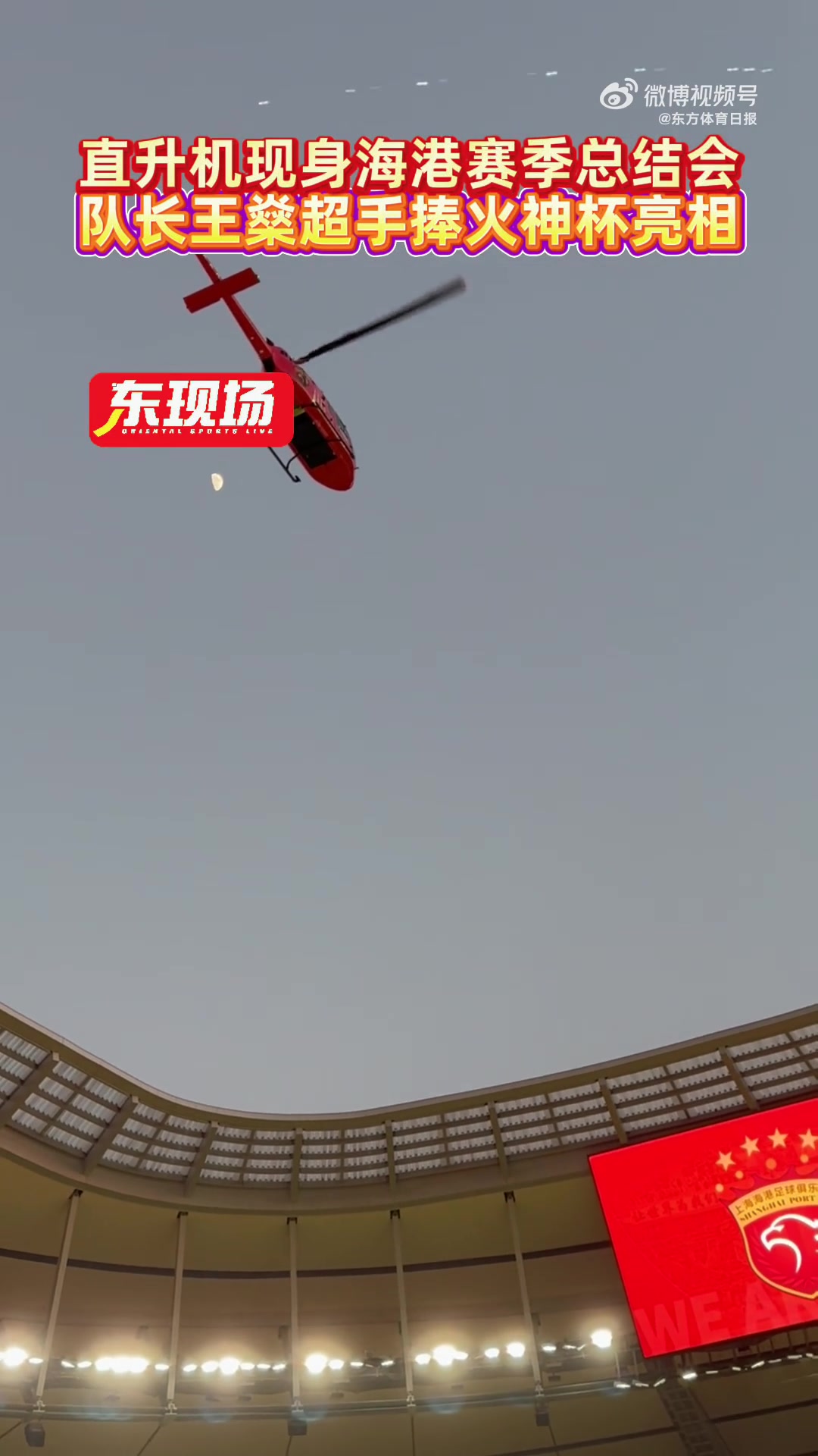 这架海港元素涂装的直升机降落在了浦东足球场的草坪上,海港队长王燊超手捧代表中超冠军奖杯的火神杯亮相。