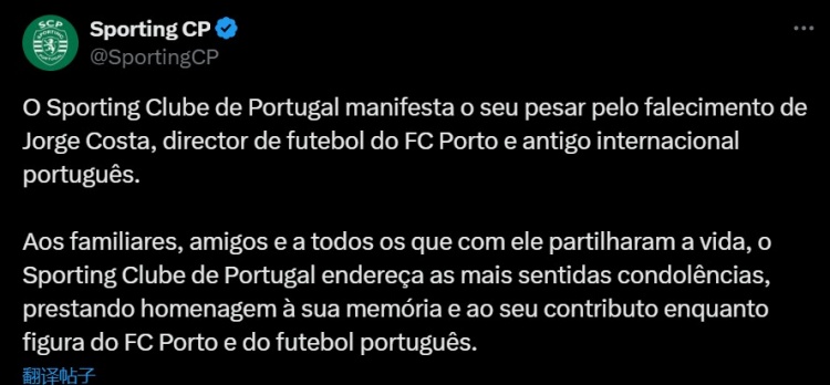 葡萄牙体育官方写说念:“俱乐部对葡萄牙前国脚、波尔图俱乐部现任足球高管若热-科斯塔的灭一火暗意悲悼。”