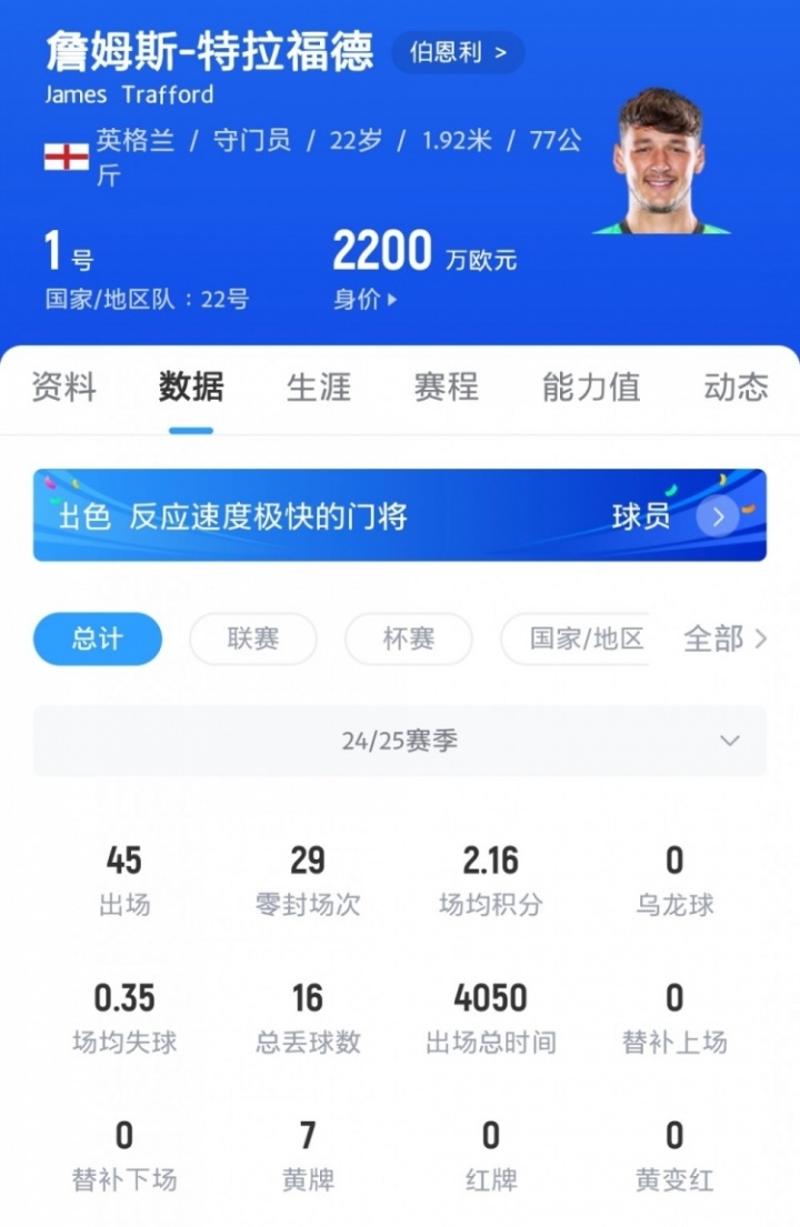 特拉福德2023年以1730万欧转会费从曼城加盟伯恩利,上赛季出战45场比赛,丢掉16球,匡助伯恩利重返英超。