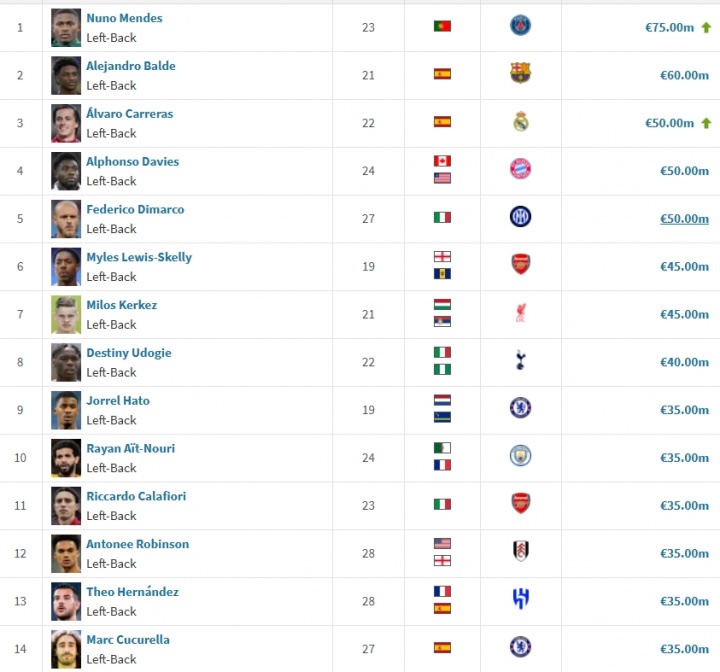 10月10日讯 德转当天更新法甲身价,巴黎左后卫努诺-门德斯身价高潮500万欧,来到7500万欧,紧紧占据天下左后卫身价榜第一位。