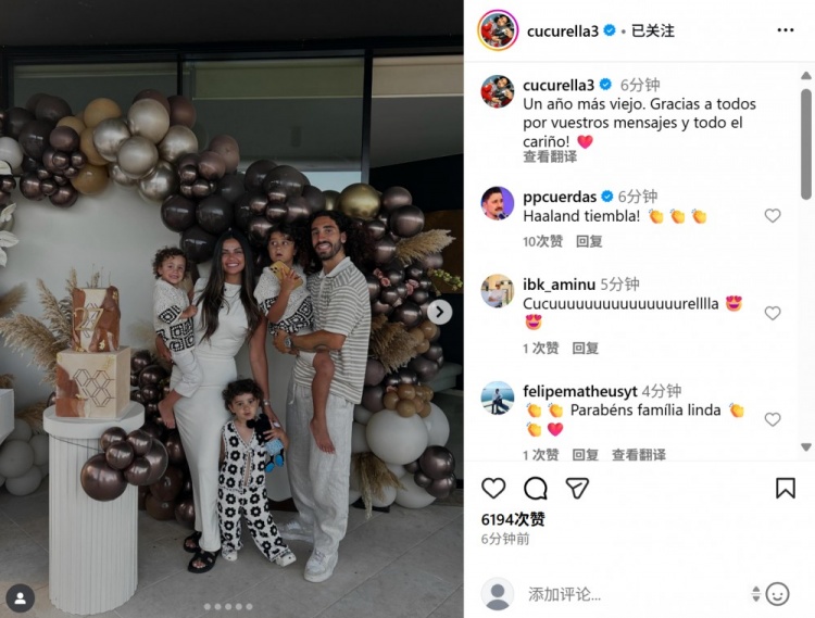 7月23日讯 库库雷利亚昨日迎来27岁诞辰,球员也在个东谈主社媒晒出与一家东谈主庆祝诞辰的合影。