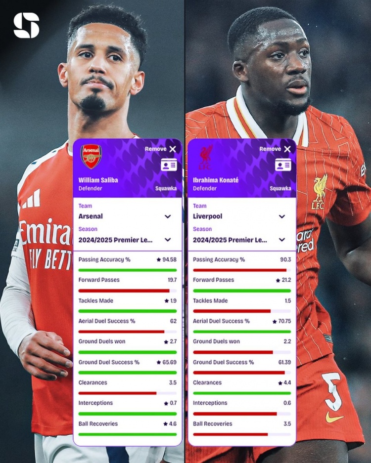 7月23日讯 最新音讯显现,皇马在同期温雅科纳特和萨利巴,甚而不扬弃同期签下这两位英超中卫。数据机构squakwa也对比了两东谈主上赛季英超的场均关键数据: