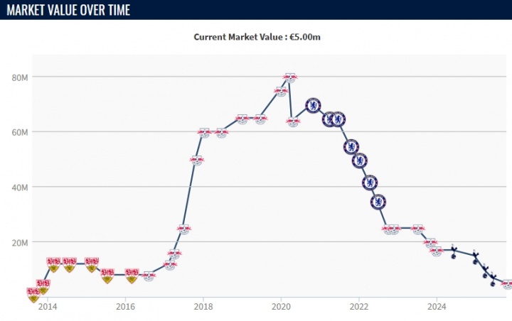 29岁的维尔纳在2020年以5300万欧元转会费加盟切尔西,亦然在2020年,球员巅峰身价一度达到8000万欧元,但如今维尔纳身价照旧跌至500万欧,他与莱比锡的左券将于明夏到期。