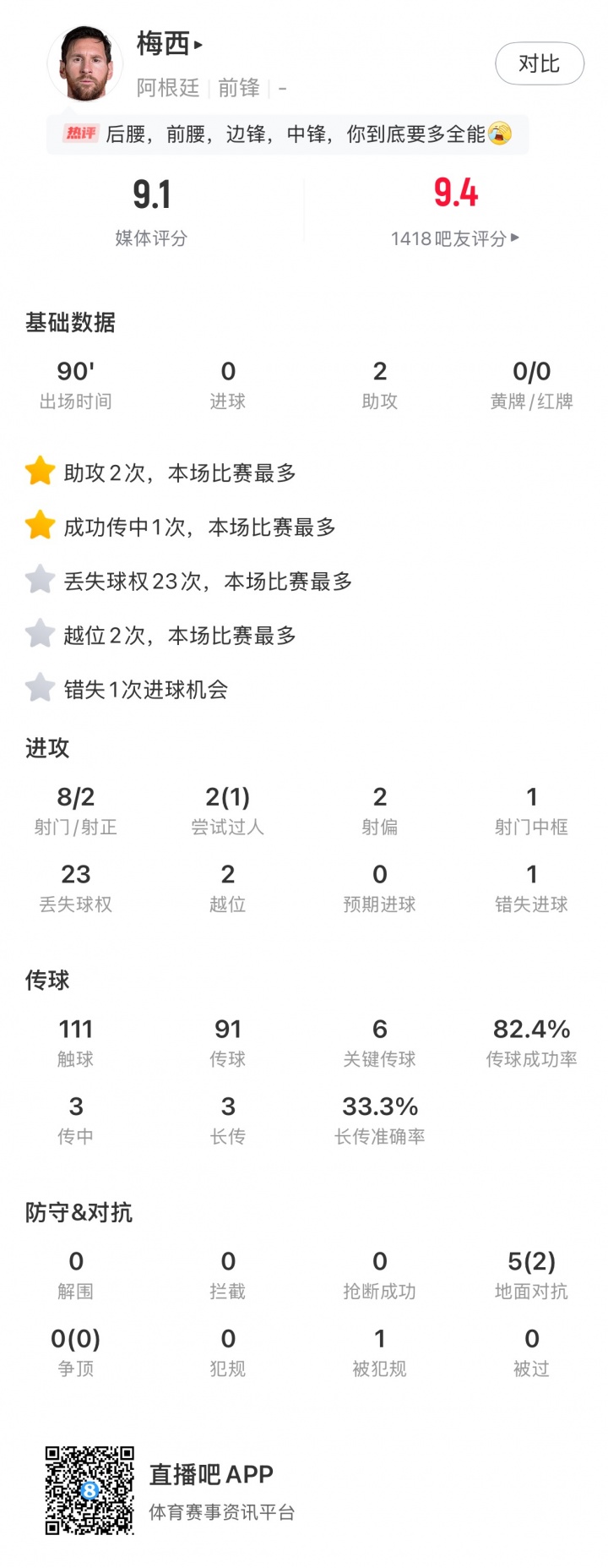 评分9.1分,8次射门2次射正1次中框,2次过东说念主1次见效,23次丢失球权。