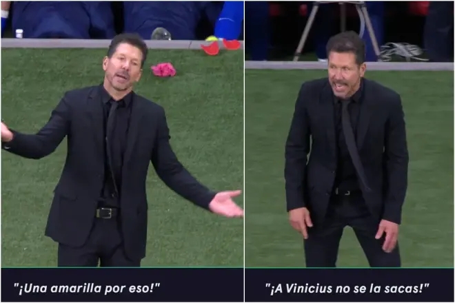 在一次犯规判罚之后,镜头拍到了马竞主帅西蒙尼正在对主裁曼萨诺抗议:“嘿!你在吹什么!纵情点!就为了这个出牌?”西蒙尼终末又摇着头说:“你不敢对维尼修斯出牌。”然后他又盯着第四官员重叠了一遍这句话。