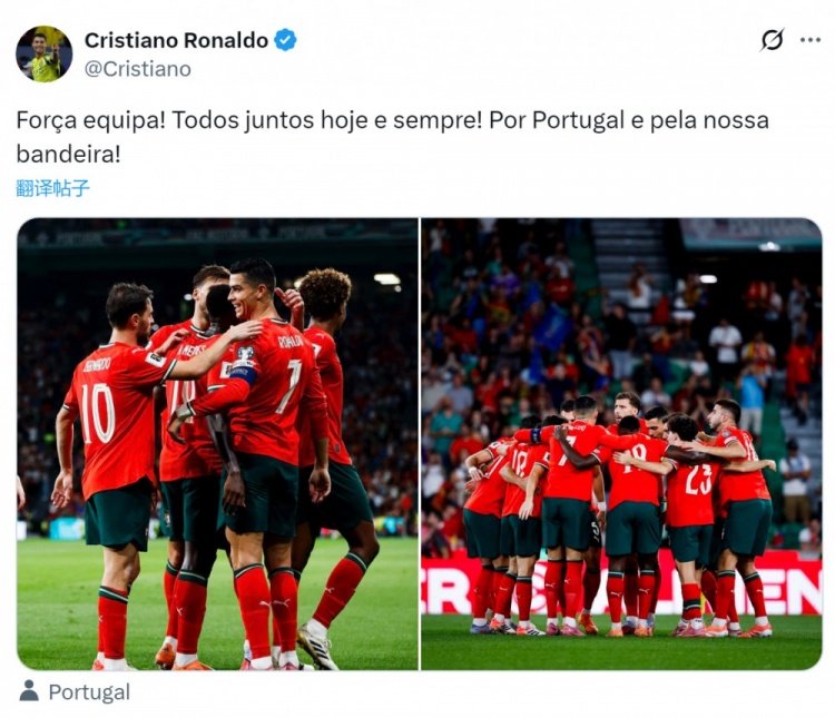 C罗染红停赛,将缺席这场世初赛收官战。C罗在外交媒体上晒出与队友们的合照,并写说念:“加油葡萄牙队!今天到永远,咱们弥远协作一心!为葡萄牙和咱们的国旗而战!”