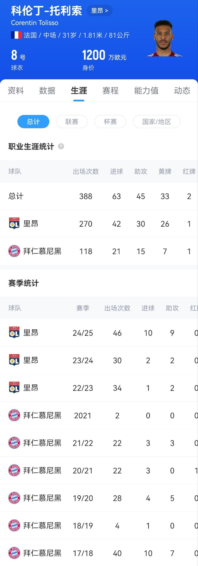 托利索13岁就加入了里昂青训,20岁升入一线队,这位中场多面手在之后的三个赛季确认出色,被其他朱门盯上,最终拜仁在2017年以4150万欧+浮动的转会费拿下了23岁的托利索,托利索也在其时成为了拜仁队史标王。