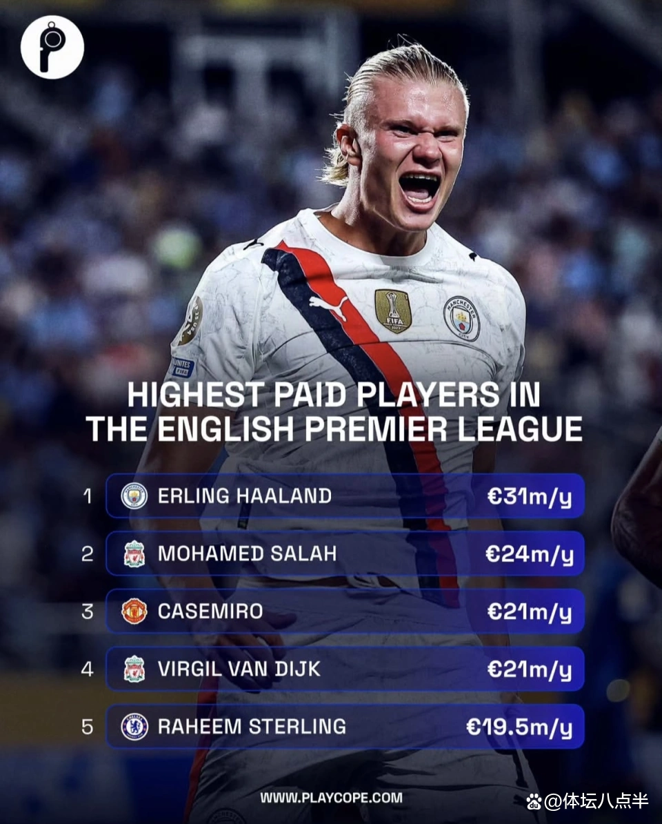 本年度榜单闪现,英超年薪最高的五位球员以及他们的欧元/东说念主民币年薪如下(1欧元≈8.38元东说念主民币):