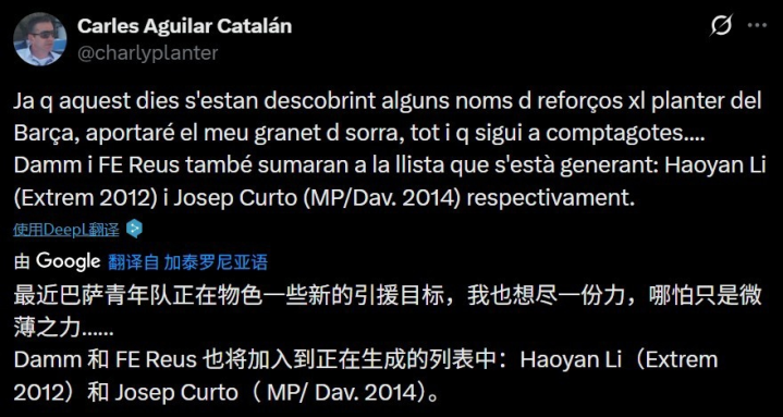 2026年4月3日,据西班牙媒体知名记者Carles Aguilan Catalan报道,14岁中国球员李昊炎将加盟巴萨青训。本赛季,中国球员李昊炎效力于达姆U14队,已代表球队在西班牙加泰罗尼亚U14荣誉职业联赛 打进了8球。据了解,他曾经攻破过巴萨U14队古代足球 门 ,给巴萨青训留下了深刻的印象,因此引起了巴萨的关注,现在已确定会在下赛季加盟巴萨青训。