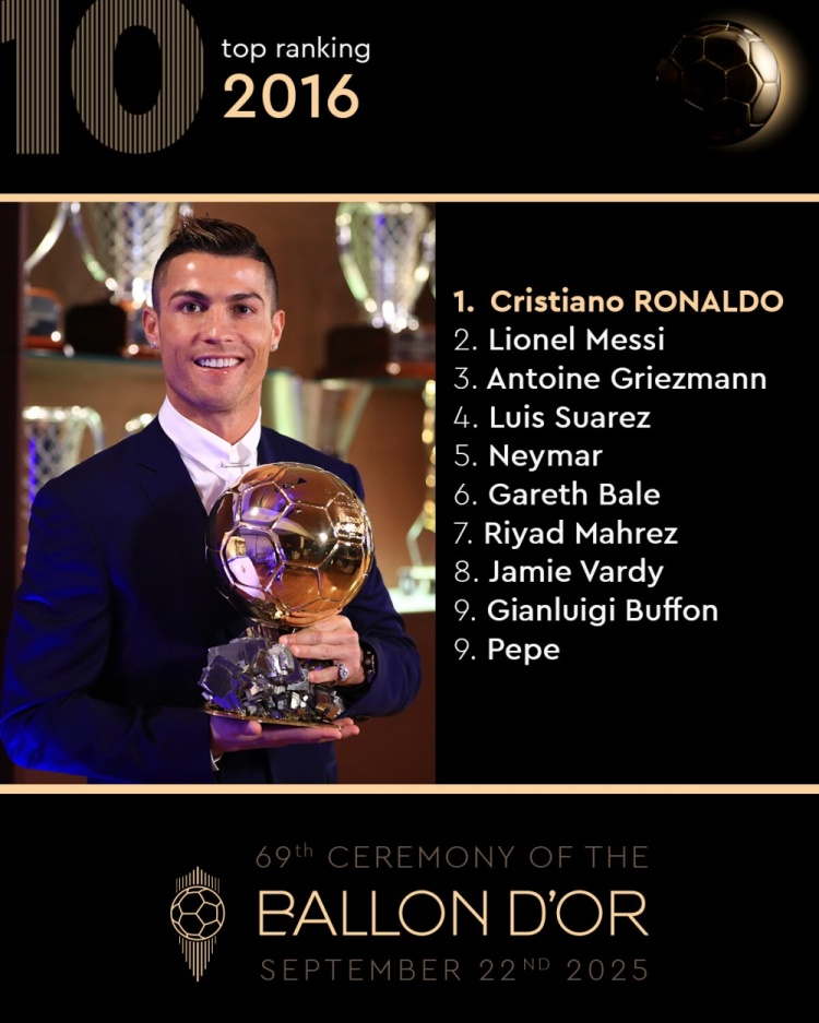 8月25日讯 金球奖官方更新社媒动态,转头2016年的金球奖前十,C罗夺魁,梅西次席。
