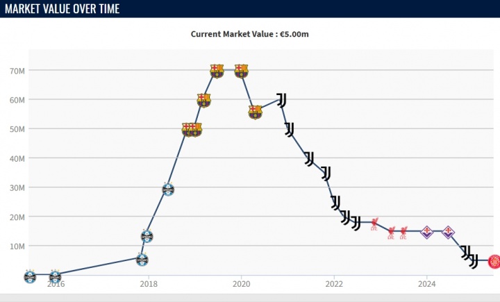 据德转数据,阿图尔与尤文的公约将于2027年到期,这位已经的天才中场也从巅峰技能7000万欧元身价,跌至如今的500万欧元。