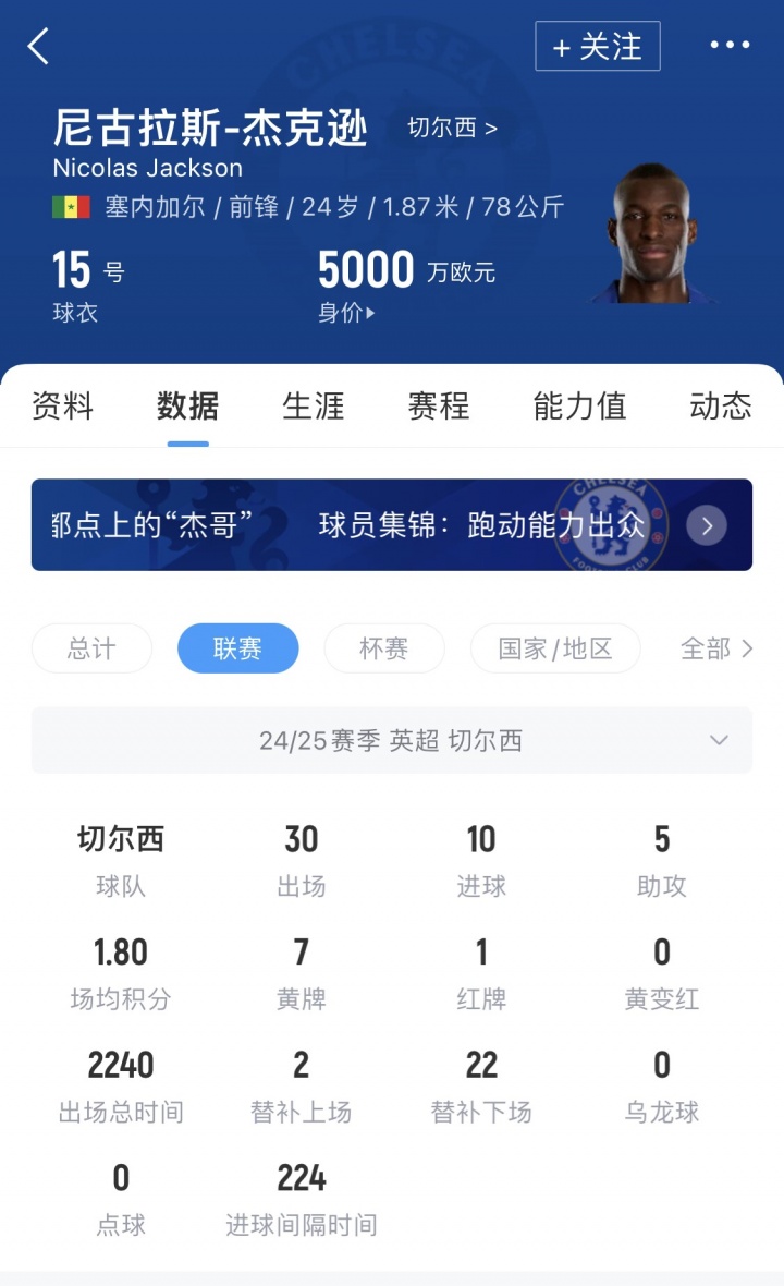 杰克逊现年24岁,当今德回身价5000万欧,切尔西2023年破耗3700万欧从比利亚雷亚尔将其引进。上赛季杰克逊为切尔西出战38场收货16球5助。