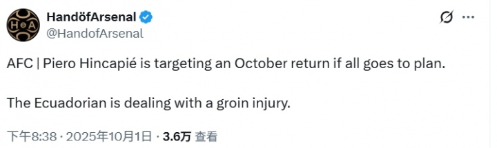 10月01日讯 据闻名阿森纳博主HandöfArsenal音讯,因卡皮耶腹股沟受伤,若一切顺利将于10月复出。