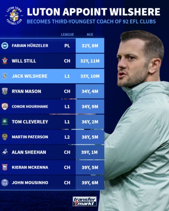 10月14日讯 德国转会商场清点了英国前四级别联赛球队主教养年岁情况,卢顿新帅威尔希尔以33岁10个月成第三年青主教养。