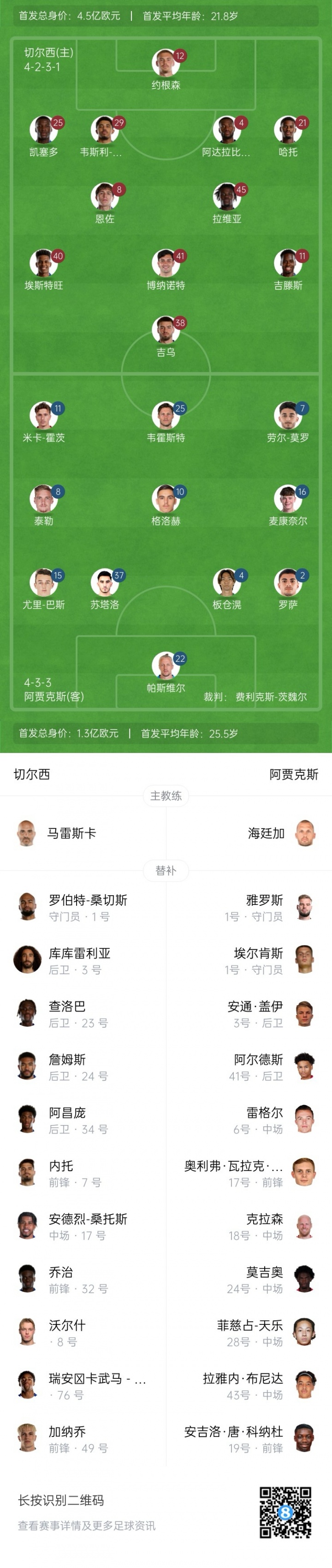 切尔西首发:12-约根森、29-福法纳、4-阿达拉比奥尤、25-凯塞多、21-哈托、8-恩佐·费尔南德斯、45-拉维亚、40-博纳诺特、41-埃斯特旺、11-吉腾斯、38-吉乌