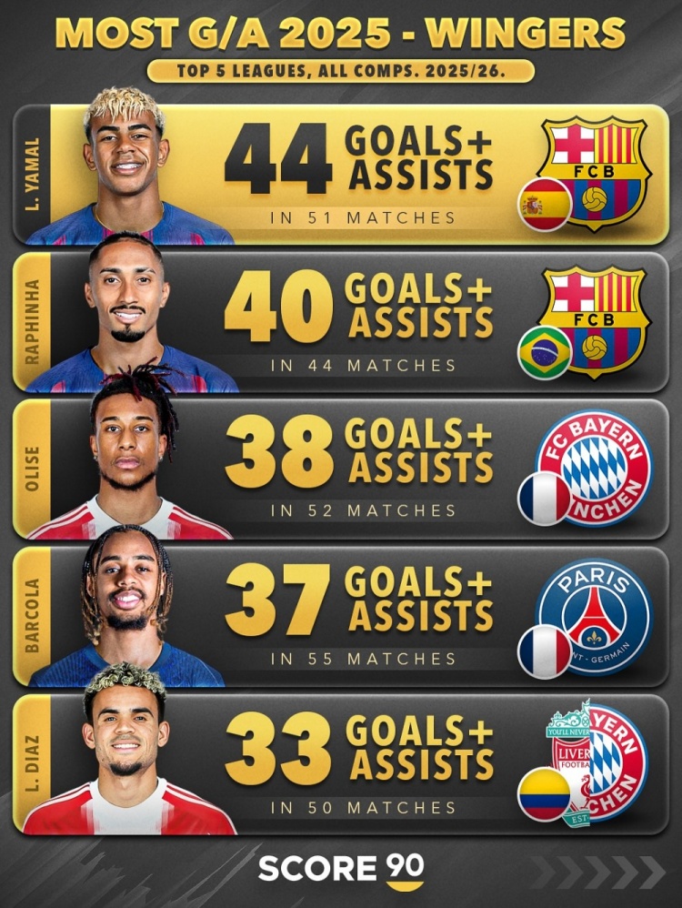 11月10日讯 Score90统计了2025年五大联赛边锋在俱乐部+国度队比赛中参与进球的数目,比肩出榜单。