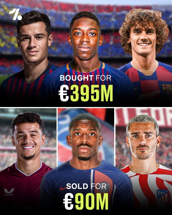 巴萨如今堕入财务景况欠安的逆境,与以前在转会市集上的操作也有很大干系。登贝莱、库蒂尼奥和格列兹曼3东谈主的转会差价,就让巴萨巨亏3亿欧。