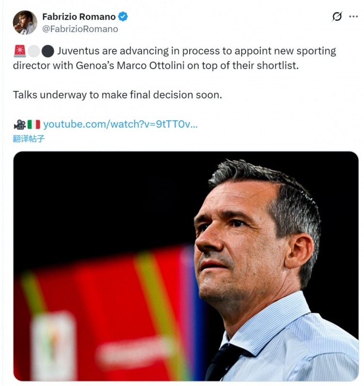 罗马诺领悟,尤文正在积极鼓励体育总监的任命职责,热那亚体育总监奥托里尼是这一职位的头号候选。关系磋议正在进行之中,以尽快作念出最终决定。