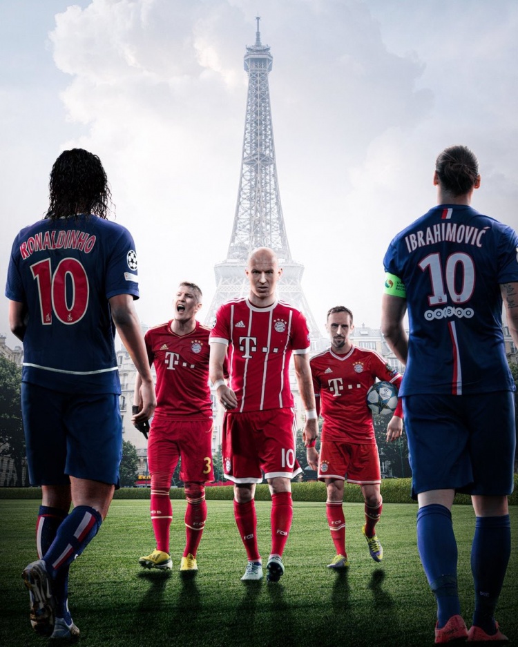 拜仁官方社媒发布海报为这场强强对话预热,拜仁方面罗本、里贝里、施魏因斯泰格出镜,巴黎则有小罗、伊布在列。