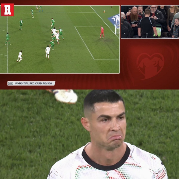 在裁判稽察VAR之前,C罗比了一个血泪算作,在他直红离场时看台上的爱尔兰球迷也集体作念出这一手势抗争。