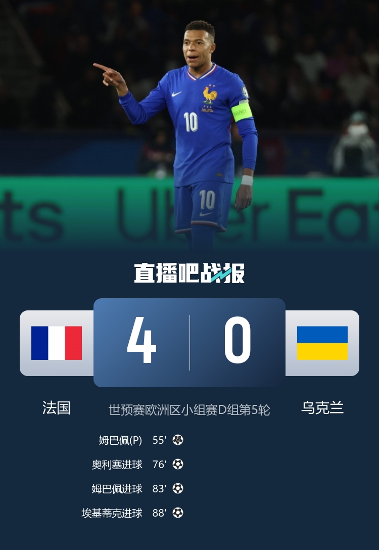 世初赛欧洲区D组,法国4-0横扫乌克兰,姆巴佩双响并解锁生存400球,法国队提前晋级全国杯!