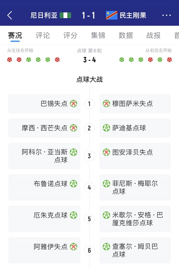 两队120分钟战成1-1,投入点球大战。尼日利亚1次点球射失,2次点球被扑,最至极球大战3-4不敌民主刚果。两队的门将发扬骁勇,差异完成两次扑点。