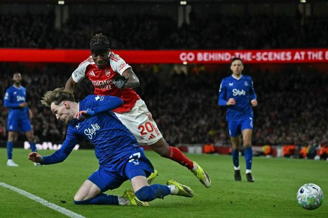 开场前20分钟,客场出战的埃弗顿就曾两次让主场球迷心惊肉跳,一次是拉亚拦截高空球没扑远,麦克尼尔的跟进补射让卡拉菲奥里演了一出“蝎子摆尾”堵枪眼。随后麦克尼尔又一脚禁区外兜射砸在了立柱上,看得场边的埃弗顿主帅莫耶斯也是抱头叹息。诚然,埃弗顿若先进球,阿森纳倒也未必不能赢——哈弗茨在上半场就有过一次绝佳机会,只是禁区内被绊倒却没有获得点球。慢镜显示,对方后卫与其上半身的拉扯确实不严重,但迈克尔·基恩的脚肯定踩到了哈弗茨的后跟,却不知为何当值主裁和VAR都没有判处极刑。