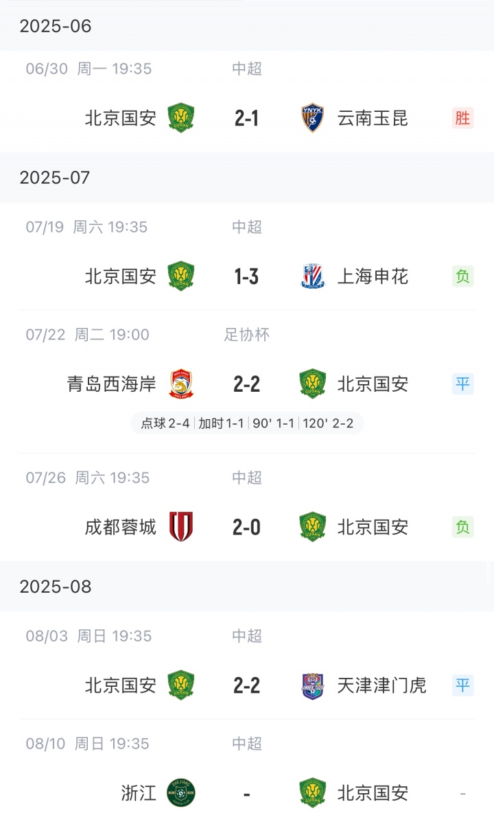 08月03日讯 本日中超第19轮,国安2-2战平津门虎,名次降至第4。