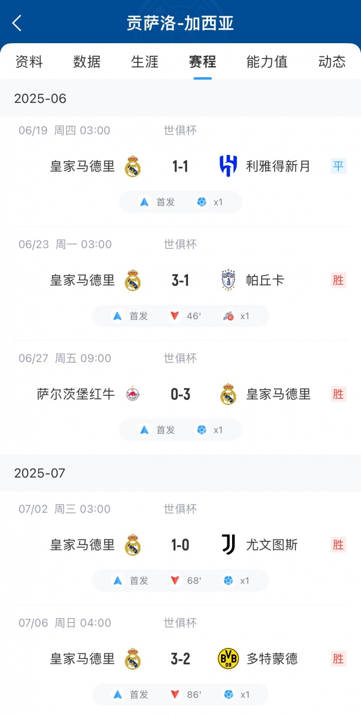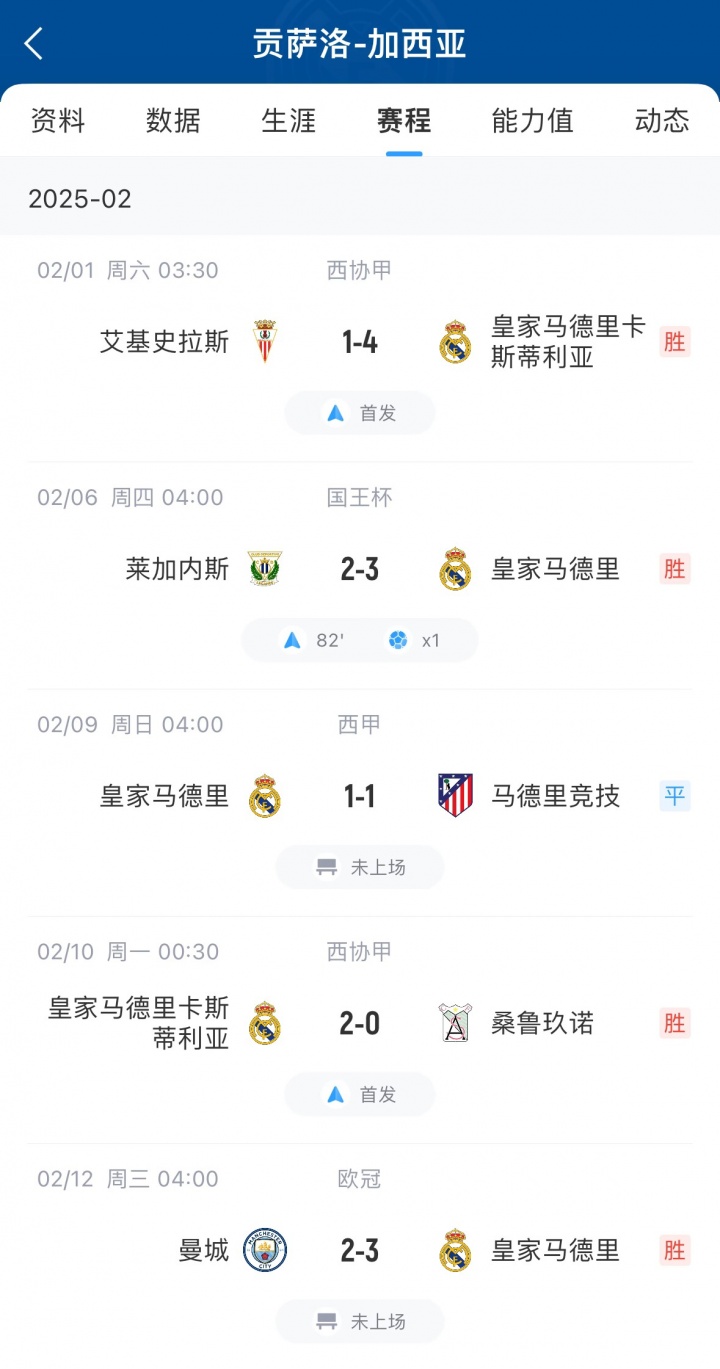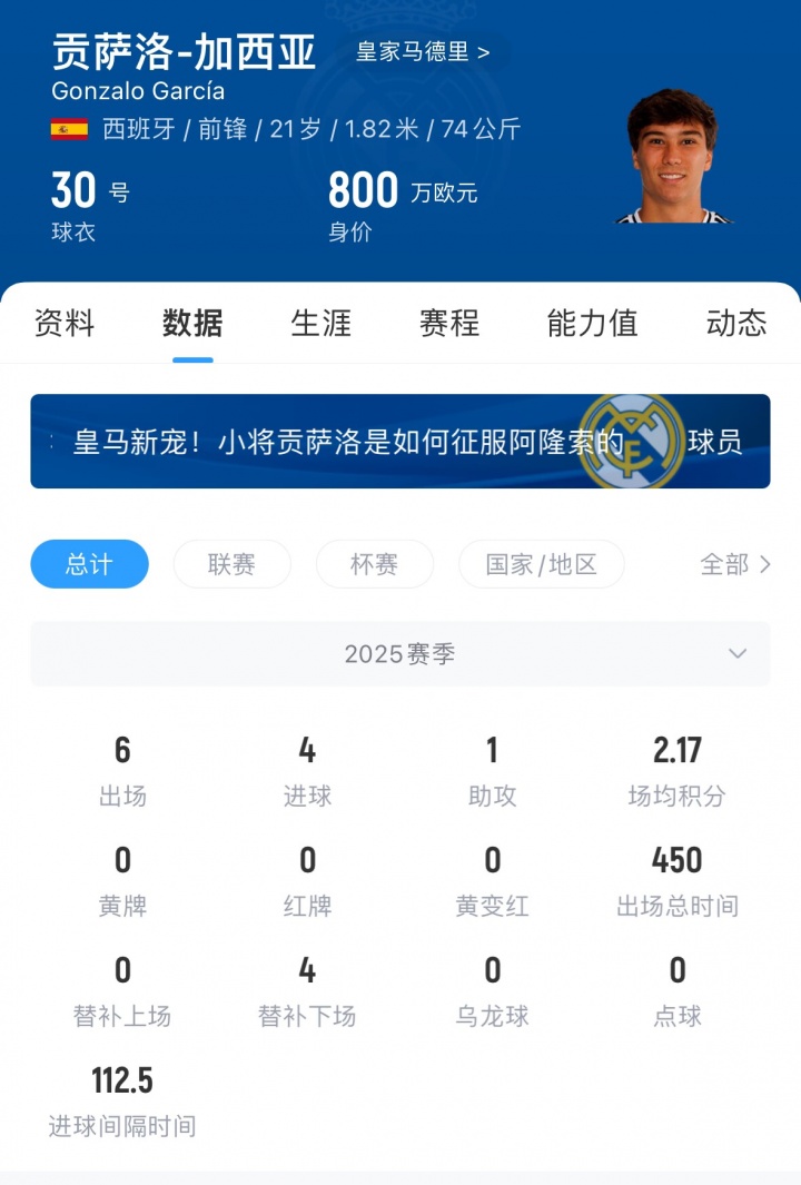 在本年2月份,贡萨洛在皇马对阵莱加内斯的国王杯1/4决赛比赛中替补登场,并在93分钟匡助球队绝杀,也打入了我方的一线队首球。24/25赛季,他大部分时辰仍代表皇马卡斯蒂利亚队成就西协甲。