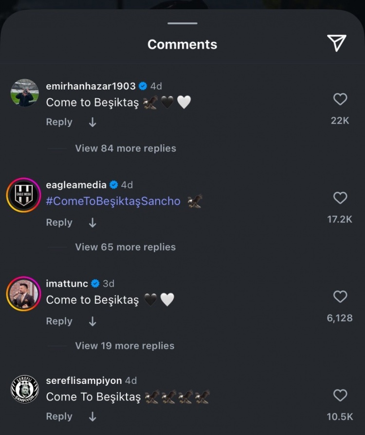 桑乔最近一条Instagram动态发布于7月24日,当今这条动态的酌量照旧耕种500万,无数贝西克塔斯球迷涌入酌量区,但愿他加入俱乐部。
