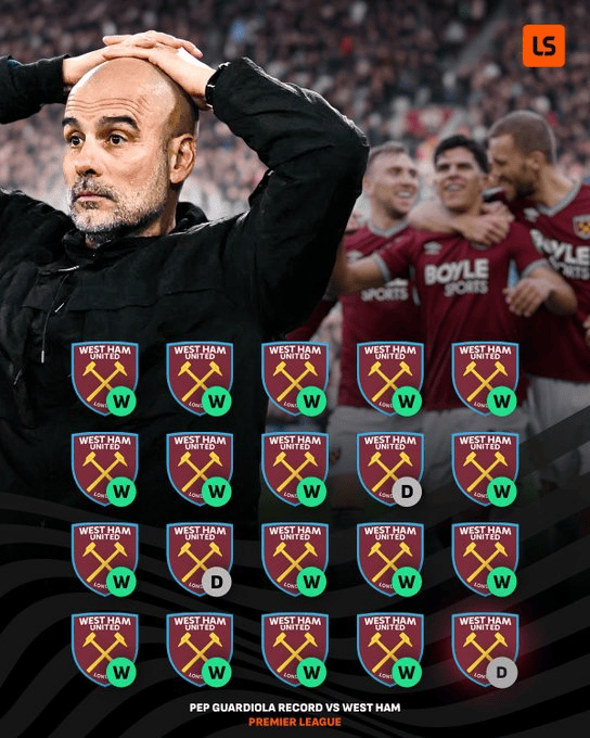 战铁锤帮17胜3平, 瓜帅刷新英超主帅对单一对手最长不败记录