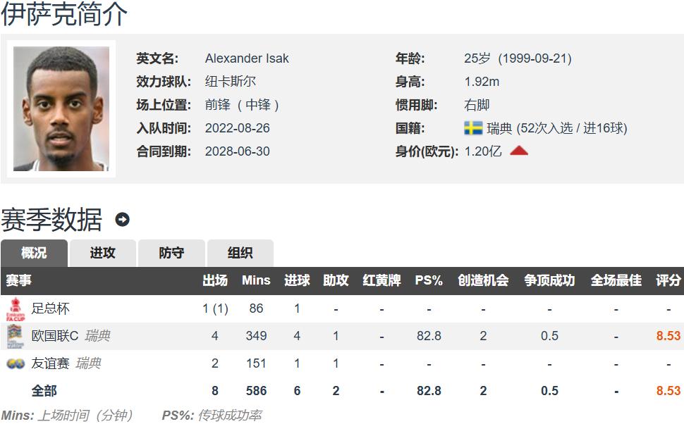 伊萨克现年25岁,身高1.92米,右脚中锋,德转估价1.2亿欧元,现存左券至2028年,上赛季34场英超23球6助。