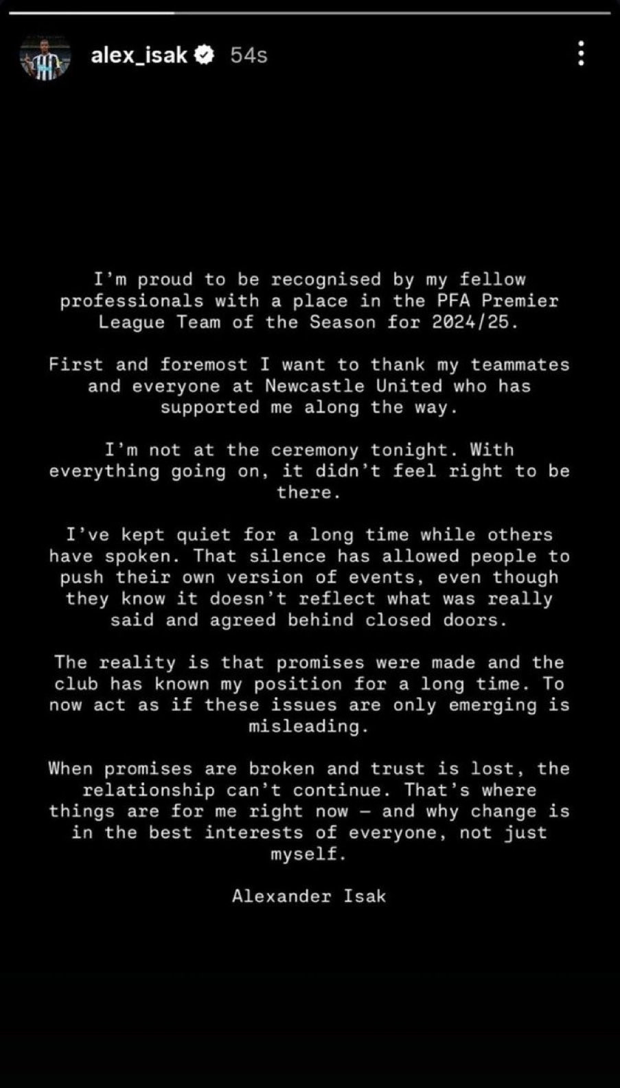上赛季的英超银靴、纽卡斯尔的瑞典前卫社媒发表声明,并对莫得出席PFA受奖仪式,并对我方的转会别传作念出了诠释。