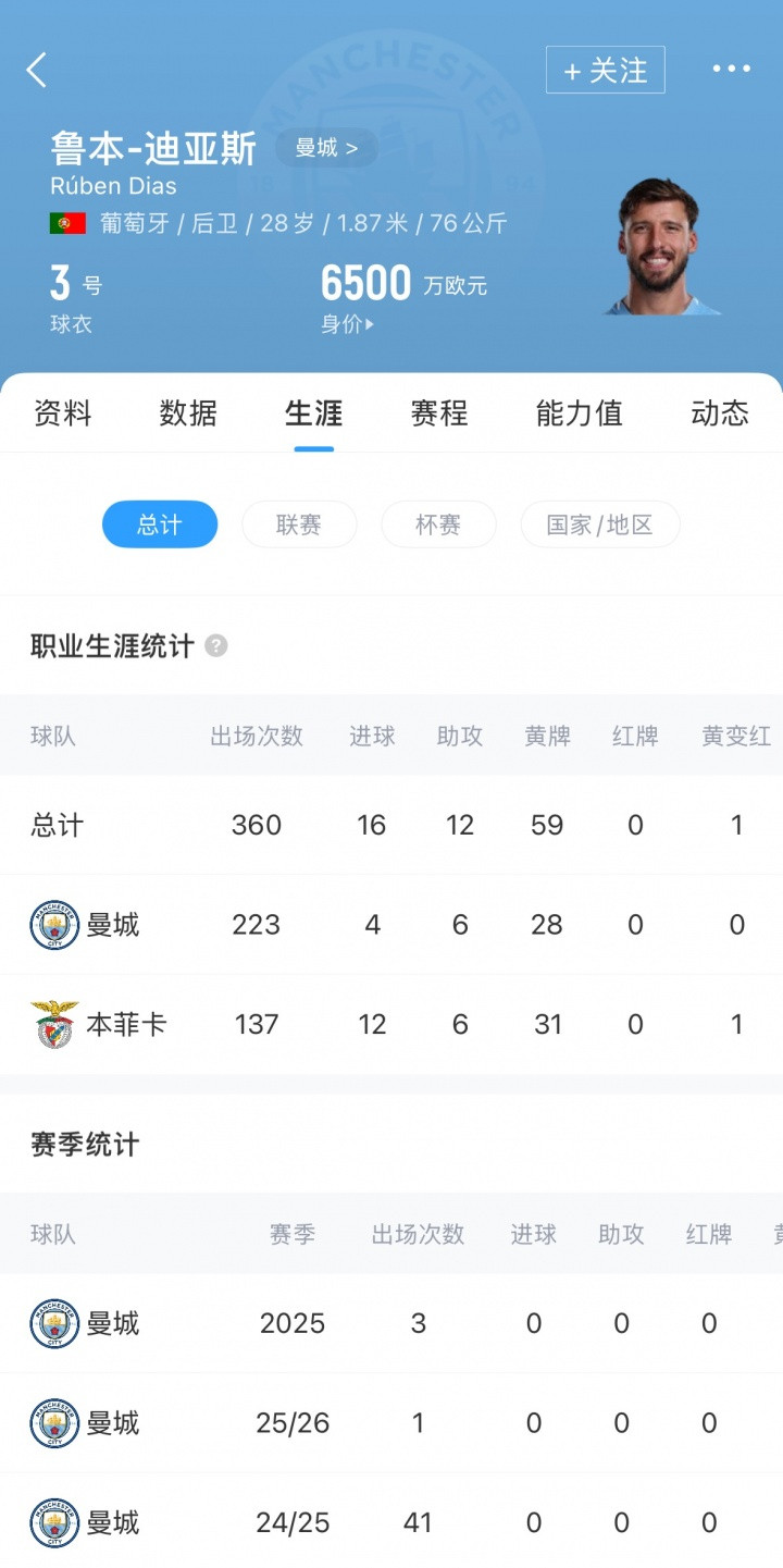 加盟于今,迪亚斯认为为曼城出场222次(孝顺4球),其中上赛季出场41次。