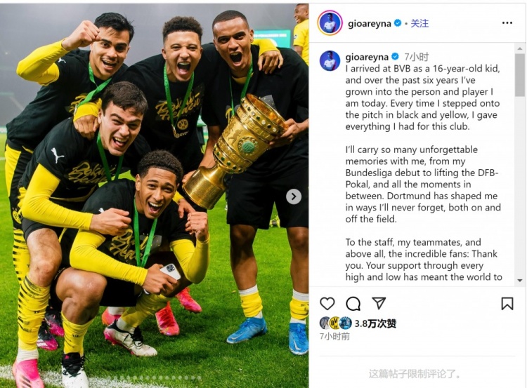 小雷纳社媒写说念:“我16岁时加入多特蒙德,夙昔6年间我成长为如今的球员,每次身披黑黄战袍踏上球场,我皆为这家俱乐部倾尽全力。