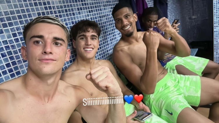 抖擞!加维社媒晒与阿劳霍、库巴西更衣室合照,庆祝球队取胜