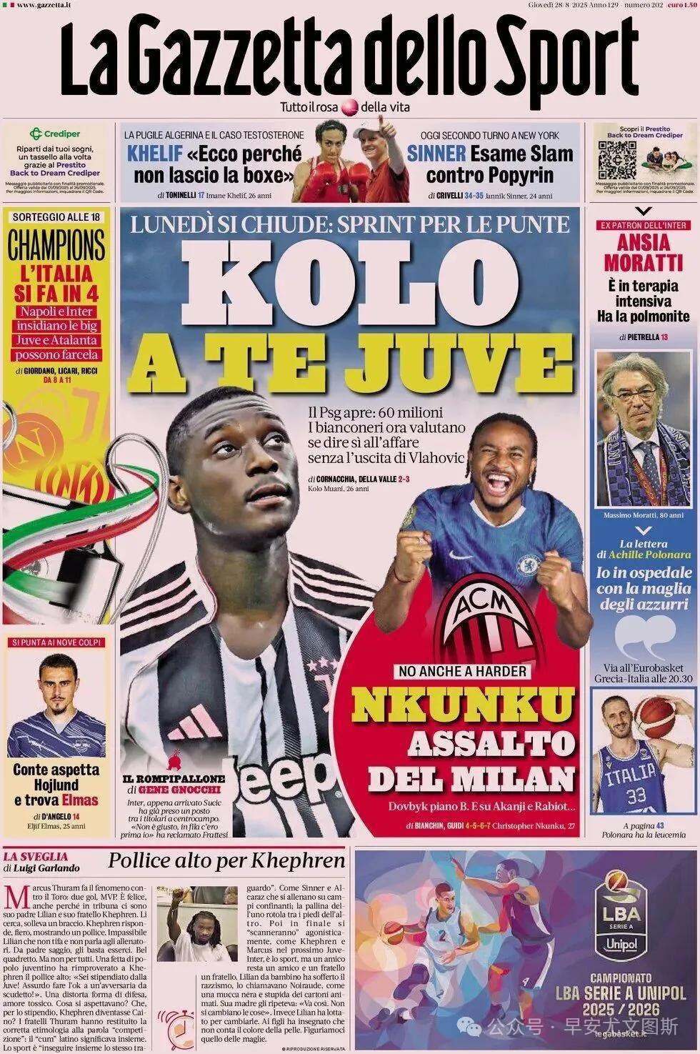 2、今晚欧冠抽签(北京时代00:00),意大利球队的寒意。
