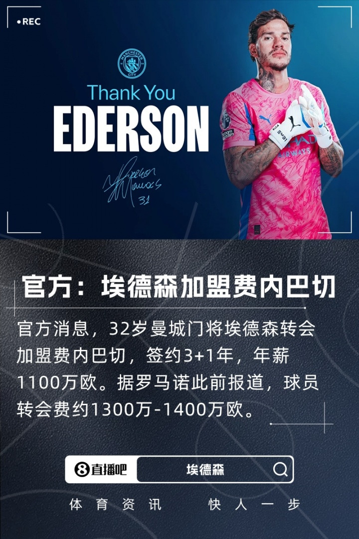 直播吧9月2日讯 官方音书,土超费内巴切精雅签下曼城门将埃德森。此前据罗马诺报谈,转会费约1300万-1400万欧。