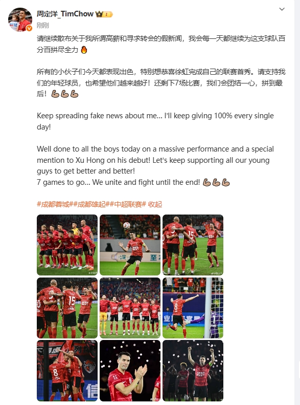 通盘的小伙子们今天齐进展出色,绝顶念念恭喜徐虹完成我方的联赛首秀。请援救咱们的年青球员,也但愿他们越来越好!还剩下7场比赛,咱们会相助一心,拼到临了!💪🏼💪🏼💪🏼”