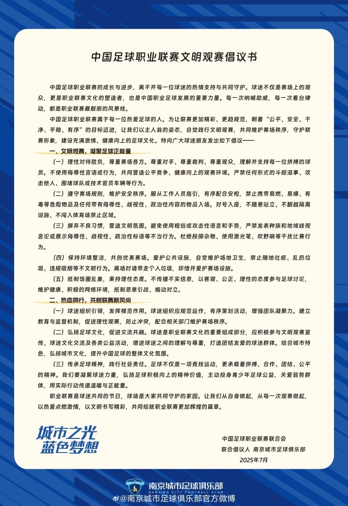 南京城市足球俱乐部文静不雅赛倡议书