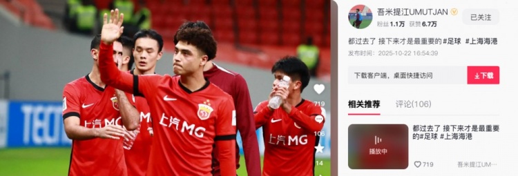 10月22日讯 亚冠精英联赛第三轮,上海海港主场0-2不敌町田泽维亚。赛后,海港球员吾米提江更新了个东说念主外交媒体。