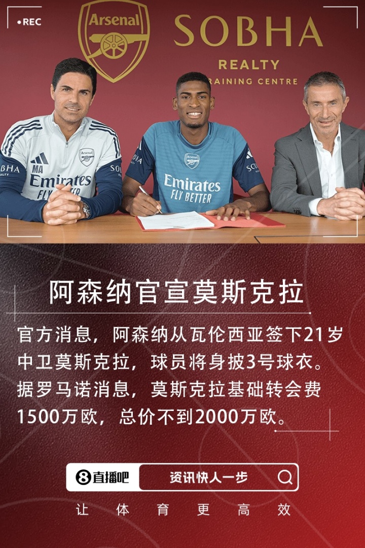 第五签!官方:阿森纳签下21岁中卫莫斯克拉,总价近2000万欧