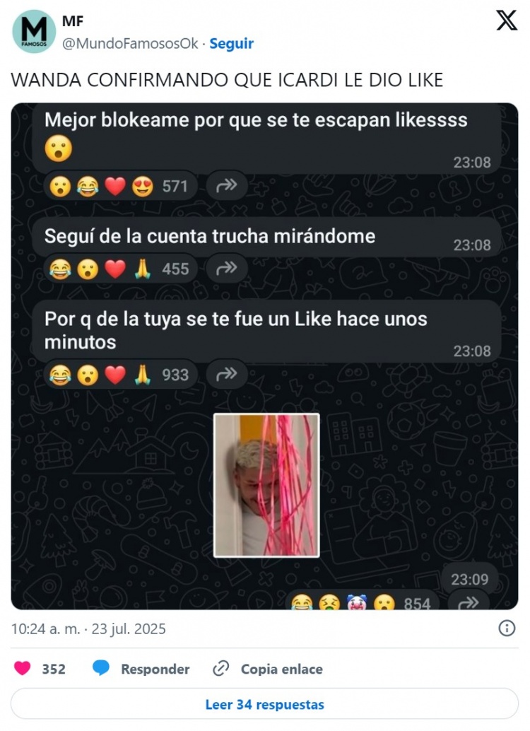 这个举动通过旺达的WhatsApp频说念被揭露,她共享了凭据,解释尽管伊卡尔迪公开示意对现任女友青睐不已,但他仍然颠倒缓和她。 旺达示意:“最佳把我屏蔽了吧,因为你老是不留意点赞我的动态,我要上传截图吗?”图中显现伊卡尔迪在旺达最近的一张Instagram像片下点赞。